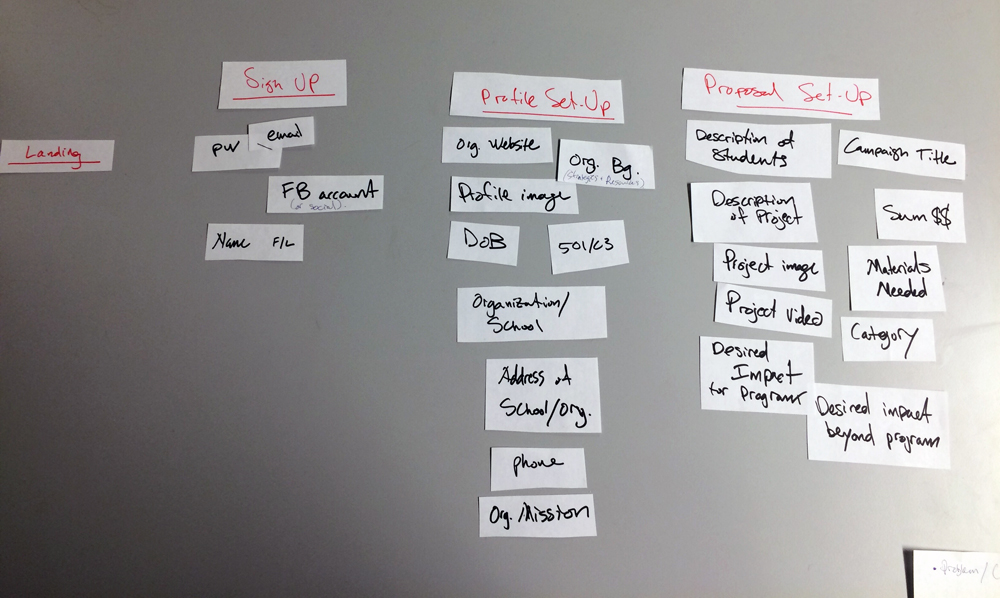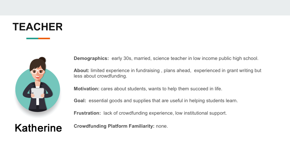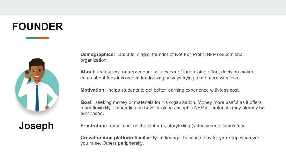 - Potential users generally fell into one of two personas: Public School Teacher, or Non-Profit Organization Founder.