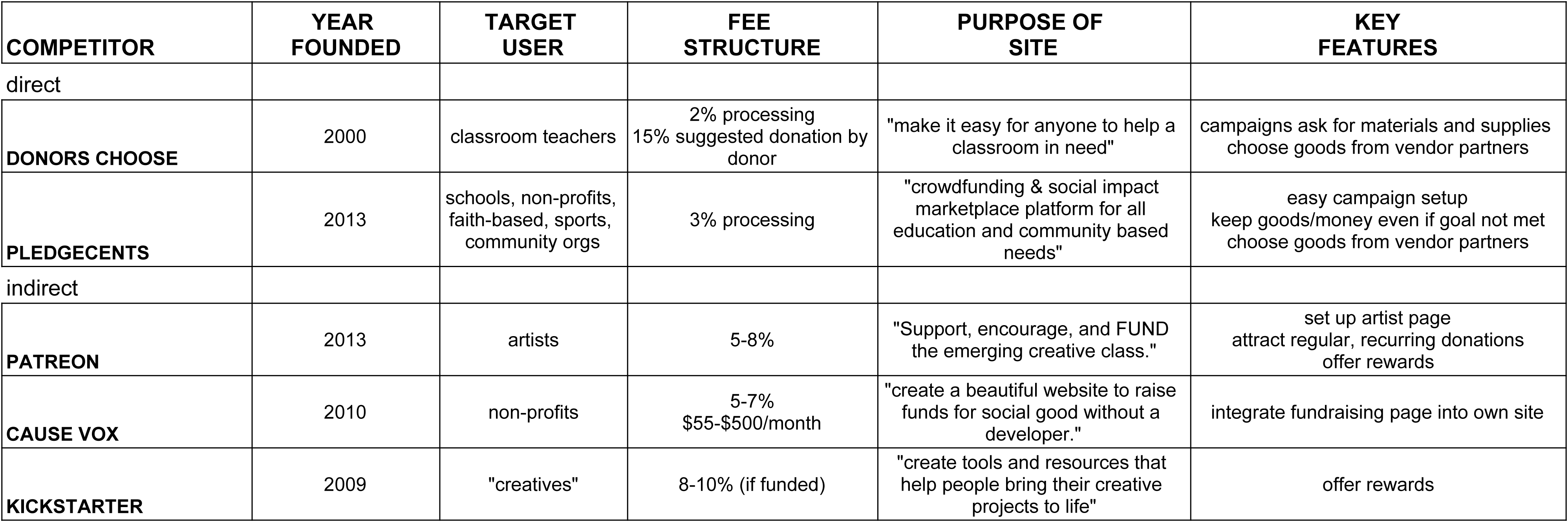 We analyzed 5 crowdfunding platforms, 2 of which - Donors Choose and Pledge Cents - were direct competitors.