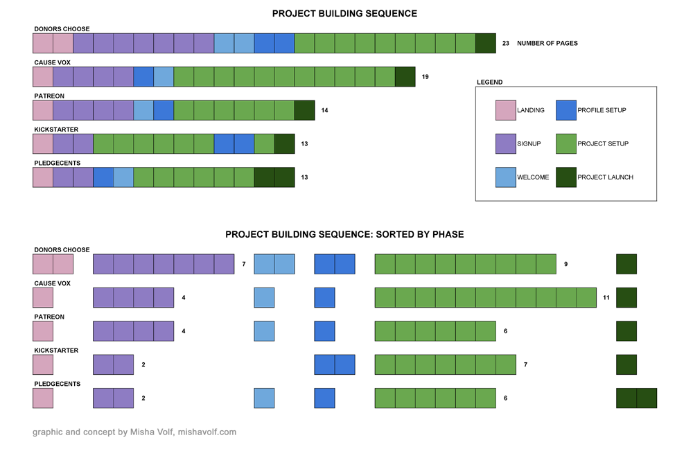 Along with the assessment of competitor's "vitals" (as seen in the table above), we also reviewed each competitor's campaign building flow. Using the Page-By method (see the Appendix), we compared the number of steps required to go "page-by-page," in order to post a viable crowd-funding campaign on each platform.