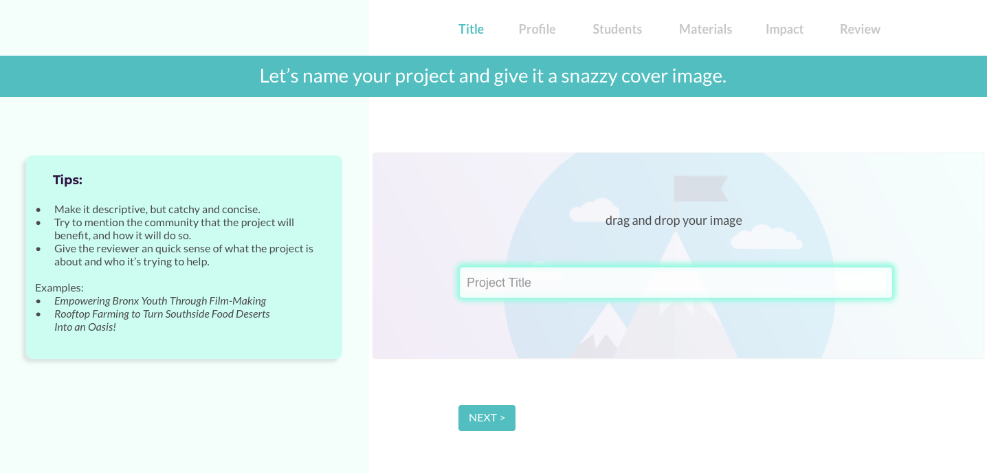 Project Title / Project Image Forward - To get users thinking about the story of their proposal right away, the form leads with prompts for the Title and banner Image. Examples are provided to give users a clear sense of what makes a good title.