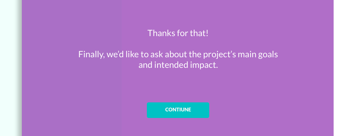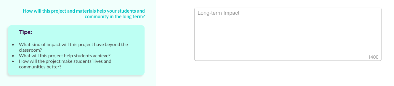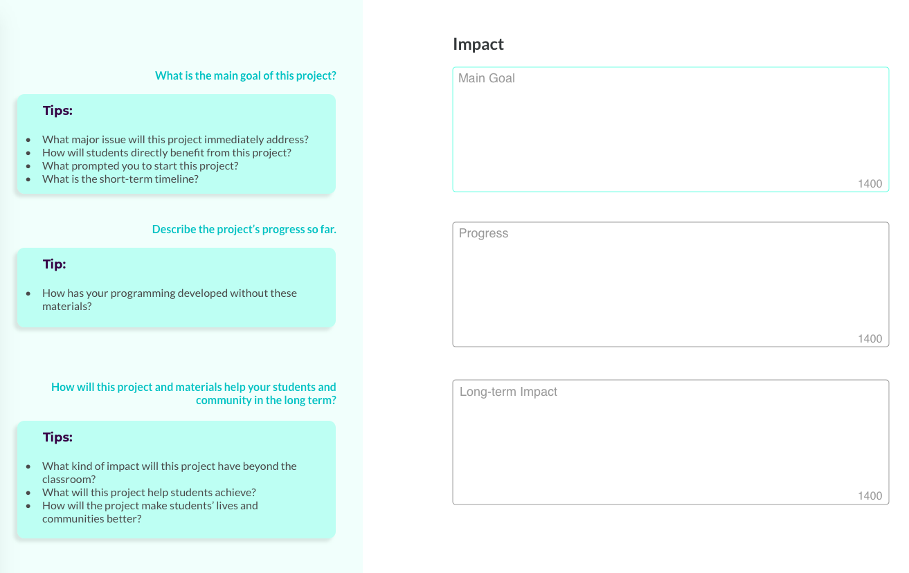 Emphasis on Impact, Big Scope - The other high priority order section is Impact and we made sure the form makes this clear. Another interstitial message sets this section up, while a separate section asking about the project's long-term impact, places the immediate needs into a broader context.