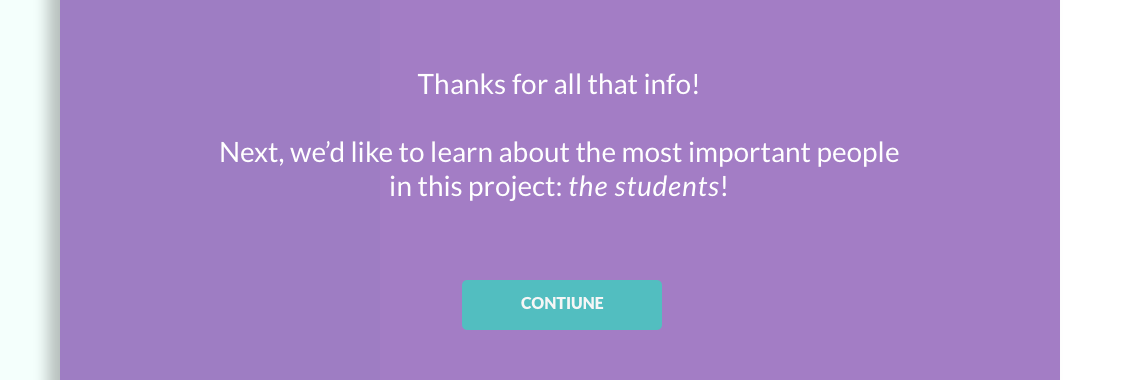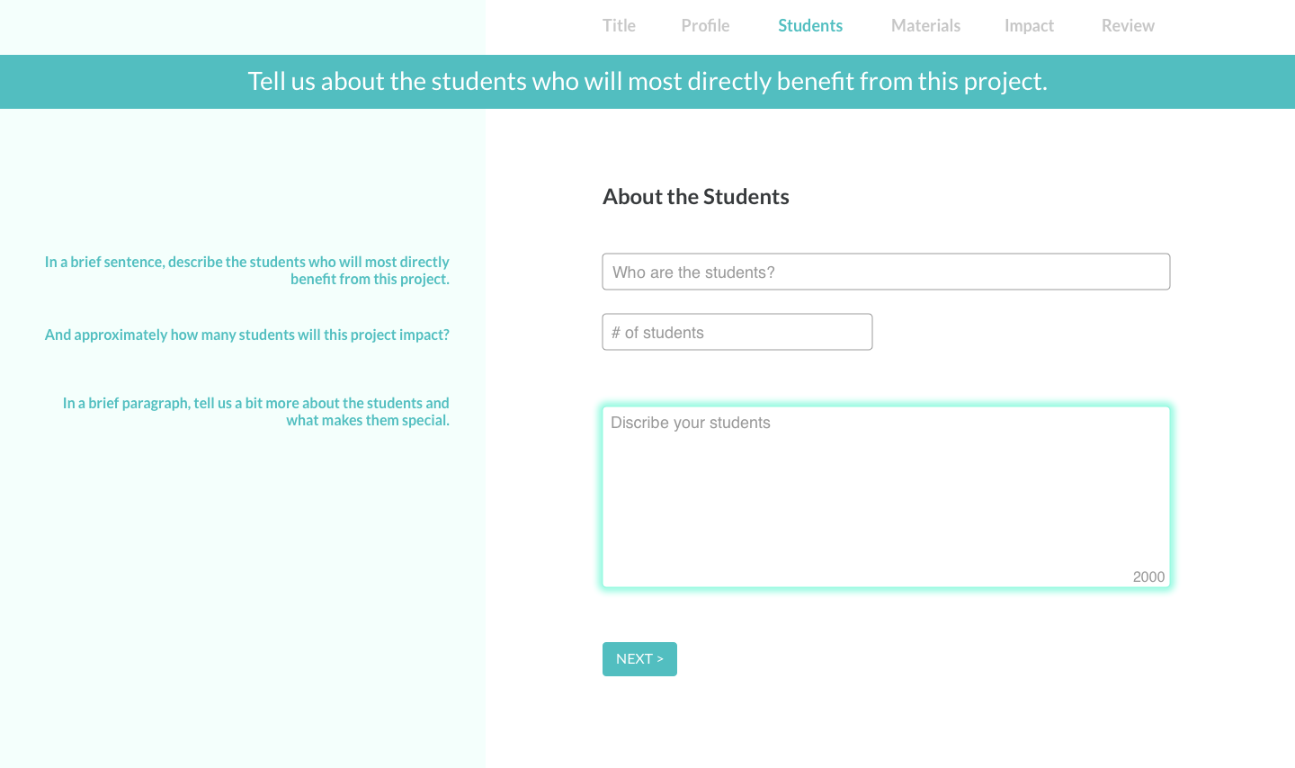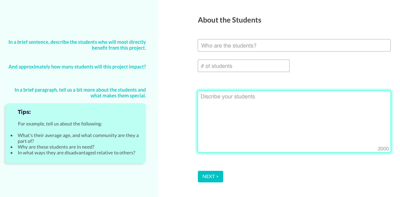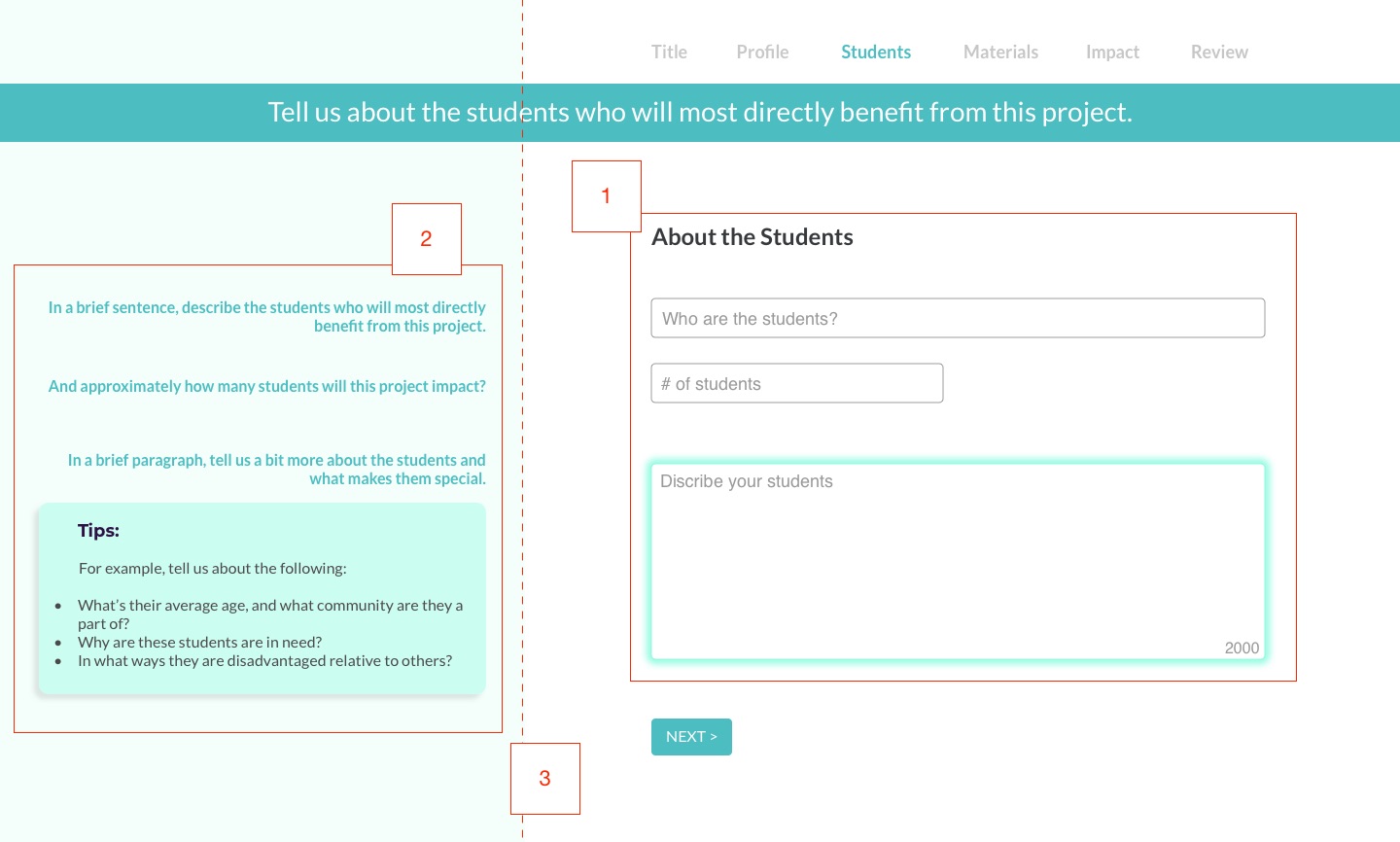 Emphasis on Students - We heard from users as well as board members that serving students should be one of the top priorities of projects. To make sure this context is understood by the user, we pre-empted the section on students with an interstitial message. Once in the section on students, users are given plenty of text-field space to describe the students, with tips providing guidance on what kind of information is being sought.